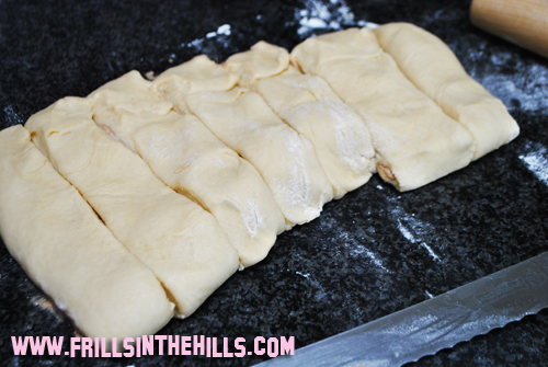 Fold up the bottom half to cover the filling, and cut into 1 inch strips